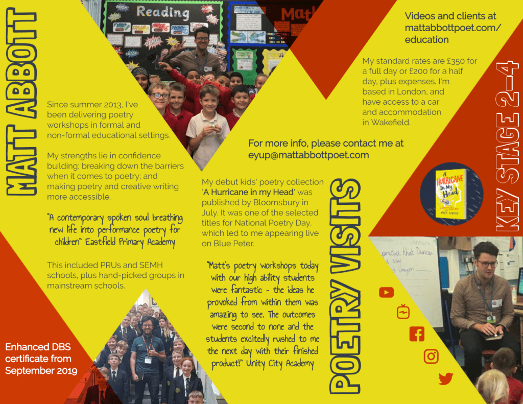 Visiting schools is rapidly becoming one of my favourite parts of being a full-time poet, and I’m on the lookout for some new bookings in 2020. There are quotes, videos and previous clients on my education page, and a brand new flyer below to showcase my MS Paint skills.