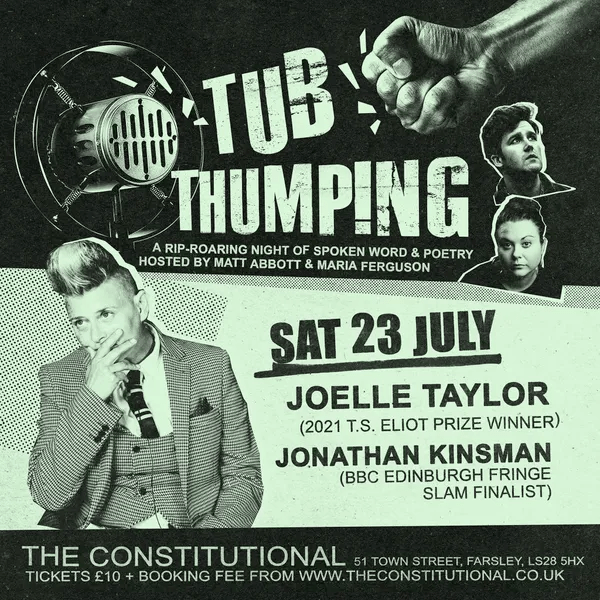 we’re back at The Constitutional in Farsley on Saturday 23 July for what’s promising to become one of the North’s leading spoken word poetry night. join us for sets from Joelle Taylor and Jonathan Kinsman, plus the showcase section!