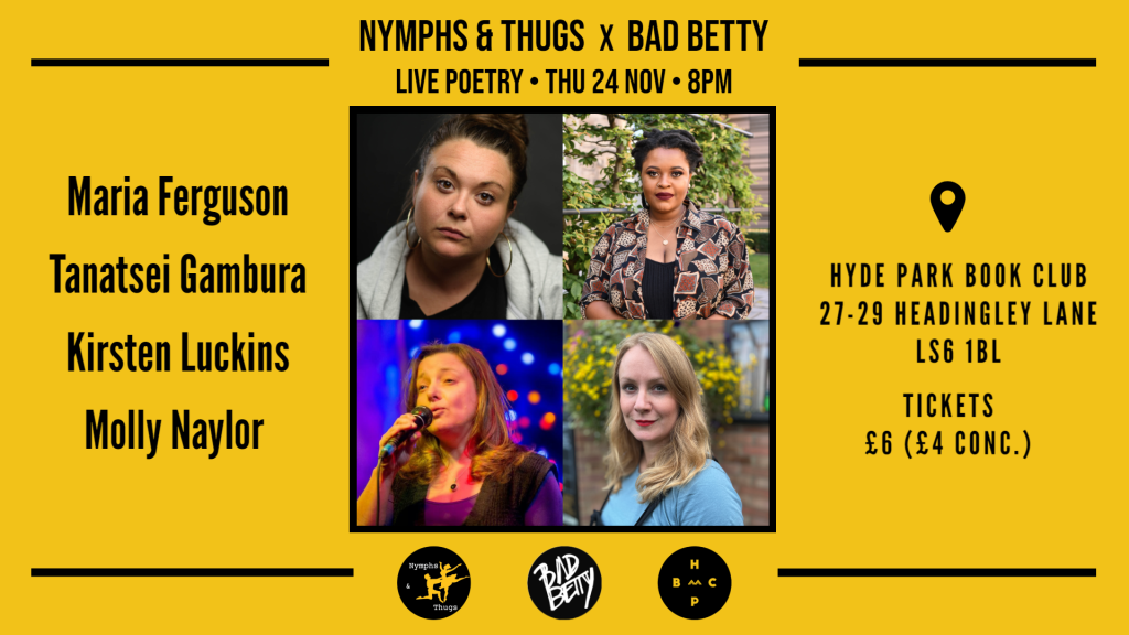 it sees N&T team up with highly-acclaimed indie poetry press Bad Betty on the Leeds leg of their UK tour. the line-up features Maria Ferguson, Tanatsei Gambura, Molly Naylor, and Kirsten Luckins. and tickets are only £6 full, £4 concessions!