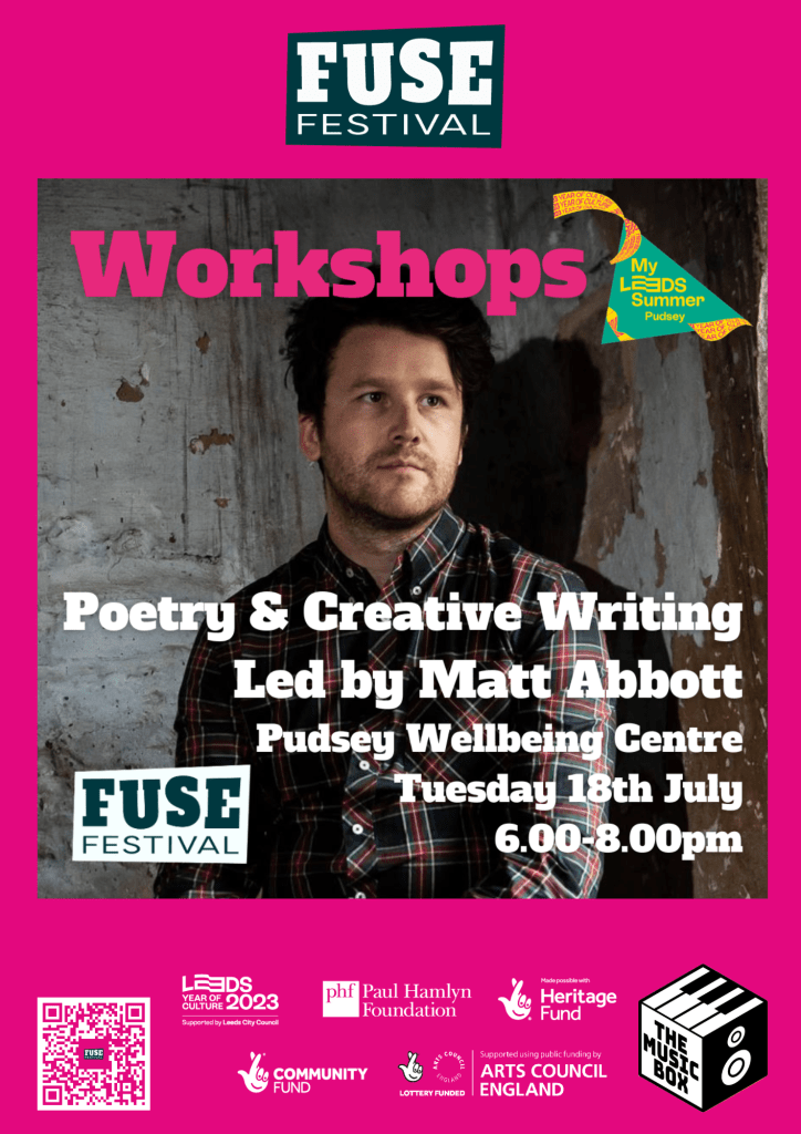 eyup! i’m gonna be delivering a free poetry/creative writing workshop for grown-ups as part of fuse festival on tuesday 18 july. the workshop will take place at pudsey wellbeing centre from 6-8pm and you can sign up here.