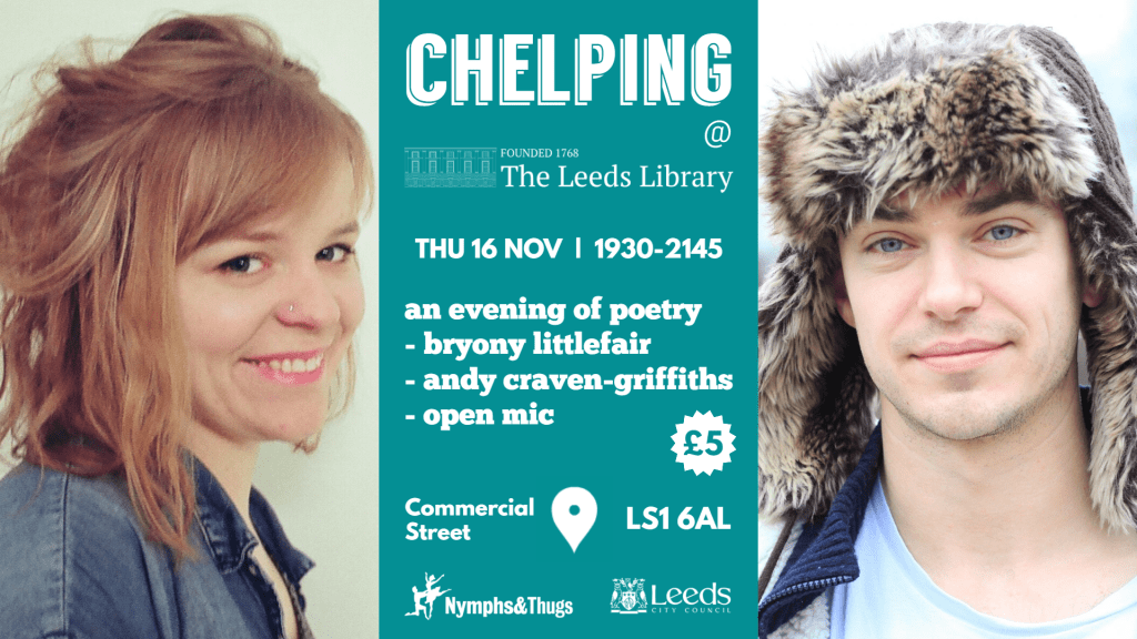 The 24th instalment of Chelping brings you feature slots from Bryony Littlefair and Andy Craven-Griffiths, plus the usual open mic section (which is now full – sorry!). Tickets are available here for £5.
