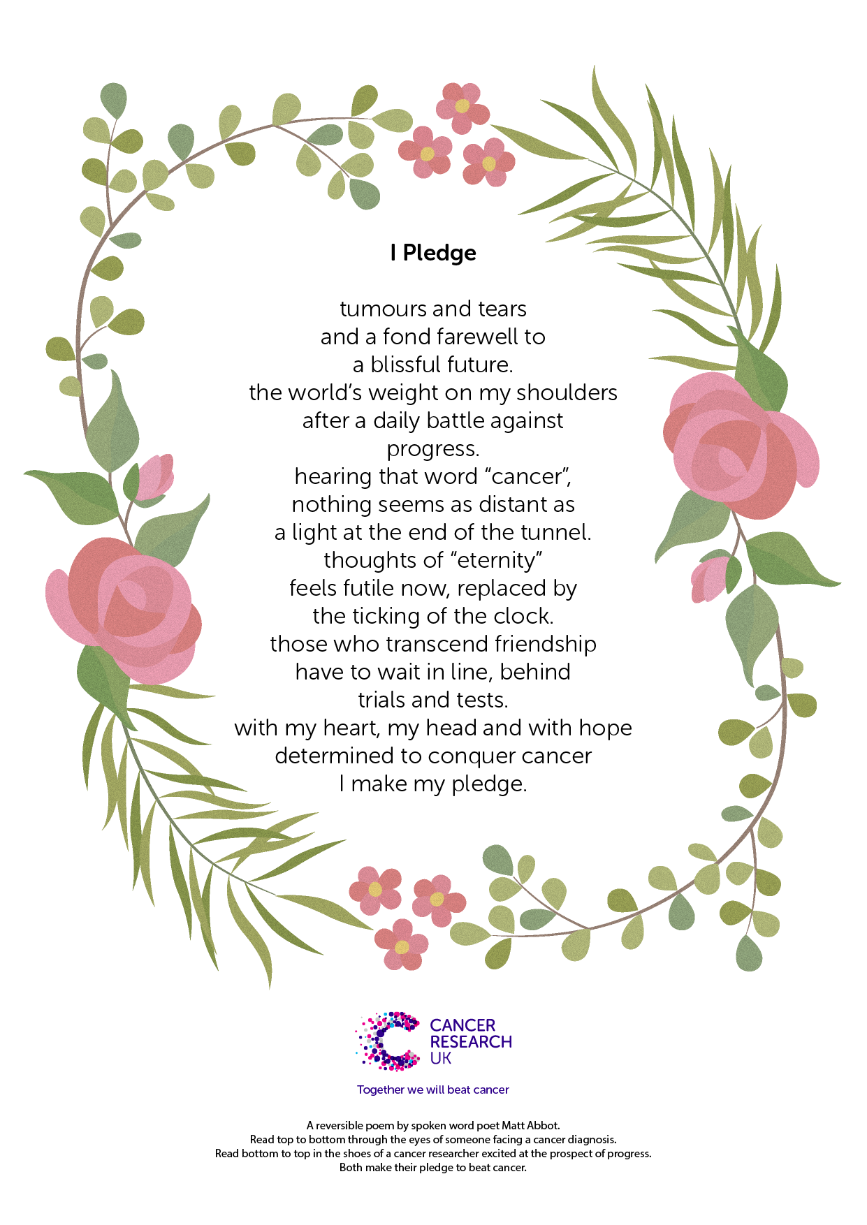 My Mum was diagnosed with cervical cancer in September 2015, and within six weeks she’d been given the all-clear. I realise how incredibly fortunate we are, but even then, it was one of the most harrowing experiences of my life. So I’m really proud to have been commissioned to write this reversible poem for Cancer Research UK.