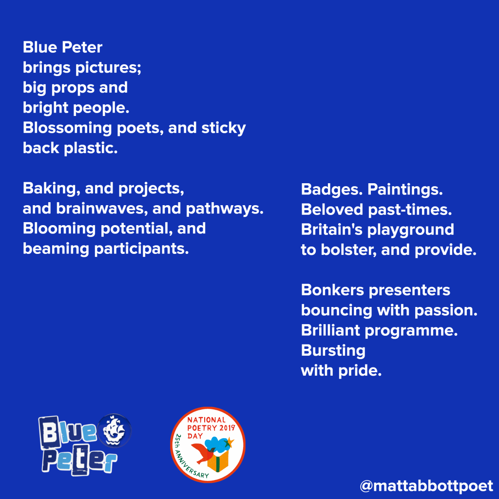 Unfortunately, I don’t have a video clip of this. But I was thrilled to appear on Blue Peter’s live episode for National Poetry Day 2019 and perform this commissioned poem as part of my appearance.